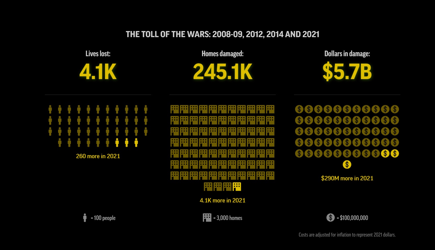Het is als een film die telkens wordt herhaald en die we zo langzamerhand wel kunnen dromen. In 2008-’09, 2012, 2014 en mei 2021 kwam het tot grootscheepse Israëlische aanvallen op Gaza. De tol was hoog. Meer dan 4.000 mensen verloren hun leven, waarvan 260 in mei; een kwart miljoen woningen werd beschadigd, waarvan 4.000 dit jaar en de totale schade loopt in de miljarden euro’s.